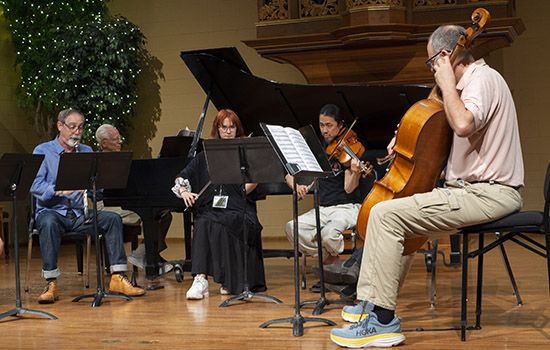 Chamber Music Weekend 2024 participants and staff  all playing the Mendelssohn Octet.
